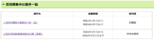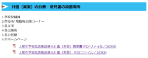 そこには、「上尾市学校給食施設基本計画(素案)への意見を募集」とあり、次のように表示されています。