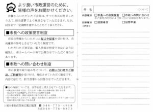 市民なら誰でも、ハガキ(市役所や支所、コミセンなどに置いてあります)や web経由で「市長への政策提言」を提出することができます。