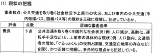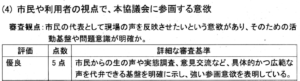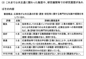 『広報あげお』の条件には無かったにもかかわらず、「公共交通の計画・運営・研究等に関する専門的な知識や経験を有しているか」を採点基準として、おまけに「職歴や研究履歴に関する記述がない。または全く関連性がない」応募者は0点だそうです。