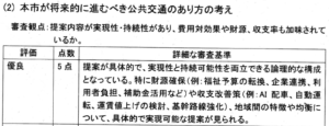 「審査観点」には、「応募者が公共交通の計画・運営・研究等に関する専門的な知識や経験を有しているか」とあります。
