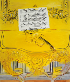デュフィのアトリエに置かれたルイ14世時代のコンソール(※)とヴァイオリン。コンソールの鮮やかで微妙に色調が変化する黄色は、下部の壁の薄い青と調和する。また、ヴァイオリンと白く浮かび上がる楽譜の音符や鏡の縁の葉飾りは、朗らかなリズムを刻んでいる。絶対的なバランスでまとめ上げられ、画家の到達した一つの美術的頂点といえる名品。