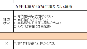 つまり、教育総務課は、《C 事務局として選任に関与できない》でも《D 自由記述》でもない回答の《A 専門性が高く女性が少ない》を選んだことになります。