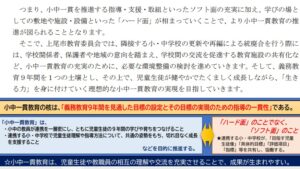 ページの下の枠内で、小中一貫教育とは《「ハード面」のことではなく、「ソフト面」のこと》と言っても、その上の文章とは矛盾しています。