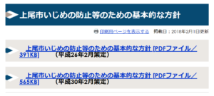 | 上尾市いじめの防止等のための基本的な方針 | 5年にわたり2つの「方針」を掲載。 後述の「疑問点その1」参照。 |