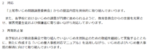 上記の市教委の記述は、裏を返せば、今回のいじめ行為についての検証と関係者の処分等には触れずに、今後の取り組みを「再発防止策」のみに限定してしまうのではないかとの危惧が生じます。