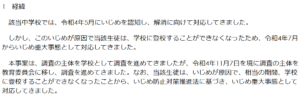 該当中学校では、令和4年5月にいじめを認知し、解消に向けて対応してきました。