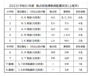 この表はイニシャルで表示しましたが、情報公開請求で入手した資料は全て実名で公開されます。目につくのは、「拠点校指導教員」として配置されているのは「元校長」ばかり7名である、という点です。