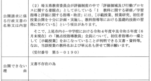 結果は「文書不存在により非公開」でした。担当である市の教育センター職員にも確認しましたが、「拠点校指導教員」が自ら示範授業を初任者に見せるということは、おこなわれていないことがわかりました。