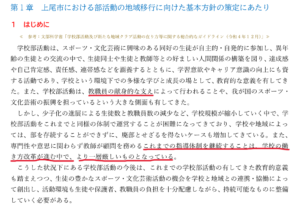 このように、『基本方針』では、「部活動の地域移行」を考える際の前提として、「学校部活動は、教職員の献身的な支えによって行われる」とされ、「これまでの指導体制を継続することは、学校の働き方改革が進む中で、より一層厳しいものとになっている」との指摘がされています。