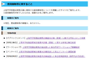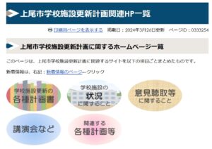 上尾市教委のHPには、「学校施設更新計画」関連のリンク先が示されています。
