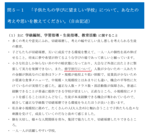 そのことは大前提として、私が「あれ?」と思ったのは、教員を対象とした「子供たちの学びに望ましい学校について(自由記述)」の中の次の記述です。