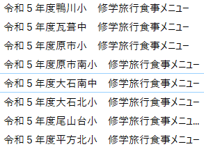 | 尾山台小・平方北小・大石南中の修学旅行宿泊先で提供された食事のメニューが判別できる文書・資料等。 |