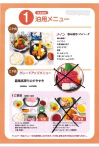 私は、市教委事務局から示された、これらの学校の修学旅行の際の食事メニューを見てみました。次の画像は、上記の内、小・中学校1校ずつの食事メニューです(画像の✖印は原本のまま。宿泊施設名は消してあります)。