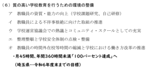 上尾市教育委員会はR6年度末までに「時間外在校等時間=月45時間以内を100%にする」を目標に掲げています。