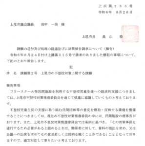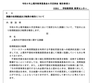 「6月議会で採択された請願について、処理経過及び結果を報告します」との記述から、「上尾市の不登校対策に関する請願」に関しての教育委員(会)への報告だと思われますが、実はそれだけではないようです。
