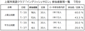 最も参加者が多かったのは7/20の上尾公民館(プレ)の18人(参加率は60.0%)。