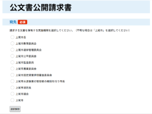 少し前までは、「上尾市」という選択肢が無かったので、市長部局宛てなのか、それとも教育委員会宛てなのか(請求内容によっては、複数の実施機関にまたがっている場合もあります)等の選択が難しいという面がありました。