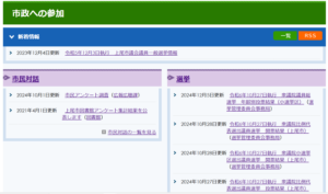上尾市のHP(トップページ)左側のメニュー「分類でさがす」から「まちづくり・市政」に進むと、「市政への参加」として記述されています。