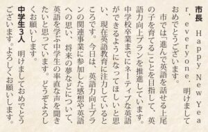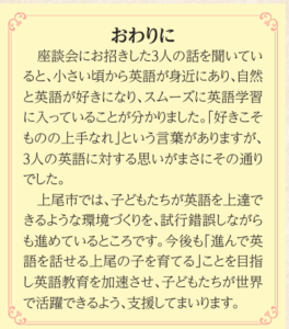 巻頭記事の編集担当者が、この「まとめ」でいみじくも語っているとおり、この『広報あげお』の記事で、生徒たちは「幼稚園の頃」や「小さい頃」から英会話教室に通って「英語を身近に感じていた」ことについて発言しています。