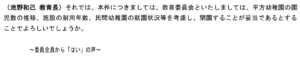 このとおり、司会者である池野教育長(当時)は、平方幼稚園を閉園するという極めて重要な問題でさえ、教育委員に1人ずつ賛否を問うことをしていないのです。