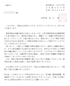 私がこの問題の対応策として具体的に市長に「政策提言」したところ、市長は上尾市教育委員会の「異常とも言える状態」を否定できませんでした。