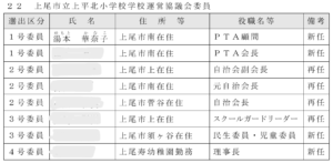 調べてみると、新しく教育委員に就任した方は、現在も上平北小の「学校運営協議会」の委員(しかも会長)であることがわかりました。