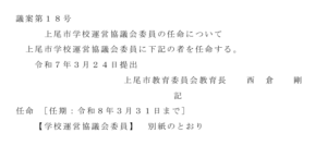この会議録により、新しい教育委員の方が上平北小の学校運営協議会の会長職にも就任していることがわかります。