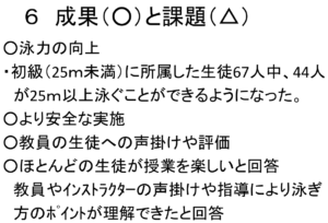 | 年間10時間は、体育の全体の時数からみるとかなり大きい。小学校は105時間がベースで、学年により違いはあるが、その10%が水泳の授業。むしろ問題は、体育の授業時間の10%を使っても、水泳指導の成果が上げられていない学校やクラスが少なくないこと。 |