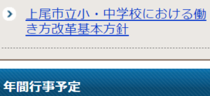 池野教育長が答弁で言及した「上尾市立小・中学校における働き方改革基本方針」については、上尾市教委のHPには、次のサイドメニューがあります。