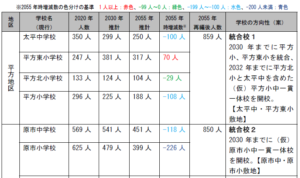 | 「2030年度までに平方小・平方東小を統合、2032年度までに平方北小と太平中を含めた(仮)平方小中一貫一体校を開校(太平中・平方東小敷地)」 |