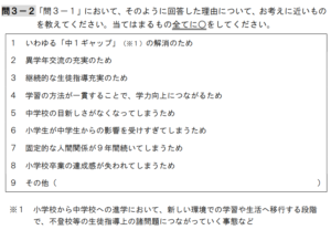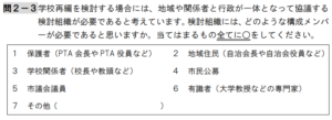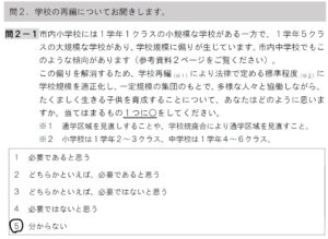 [問2-1]は、「誘導的質問」の典型です。「多様な人々と協働しながら」の主語がわかりませんし、「学校の再編」の定義を明確に示さずに「たくましく生きる子供を育成することについて、あなたはどう思いますか」などという質問は、「学校の再編は必要である」という回答に誘導していることは明白です。