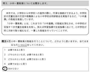 私の回答にあるように、何をもって「小中一貫教育」としているのか、その説明がありません。設問を作成する際に、どのような検討をしたのか、大変疑問です。