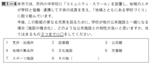 | 〖9.この設問には回答できない〗 なぜならば、「学校が他の公共施設と一緒になる場合」という前提がおかしい。 コミュニティスクールの根拠法令は地教行法(注:地方教育行政の組織及び運営に関する法律)であり、連携としての社会教育法においても、施設の複合化については触れられていない。 この設問は、そうした法的根拠についての説明の無い「市教委にとって極めて意図的な、都合の良い設問」であると言わざるを得ない。 |