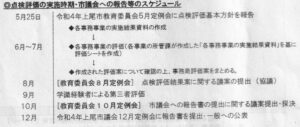 毎年度実施することが法律(地教行法)で義務付けられている「教育委員会の事務に関する点検評価報告」。これについては、教育委員会5月定例会で、池田教育総務課長は次のように発言し、スケジュールも示しています。