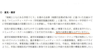 コメントの最後に、「毎年の成果を積み上げていきたい」との記述がありますが、この文言は第三者としてのコメントというより、主体者(=実際に事業に携わる者)の発言であると言えます。それはそうでしょう、この時は堀越洋子氏は芝川小の学校運営協議会の会長だったのですから。つまり、堀越洋子氏は、この事業については第三者としてのコメントを述べる立場にはないのです。